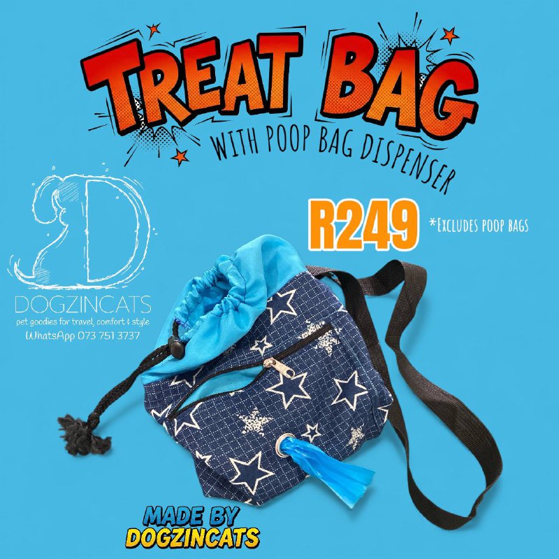 A beautiful treat bag that also has space for a roll of poop bags. Simply place your pet treats in the bag and place your poop bag roll in the front pouch. Pull part of a bag through the eyelet and you are ready to go. Just tear off as needed.