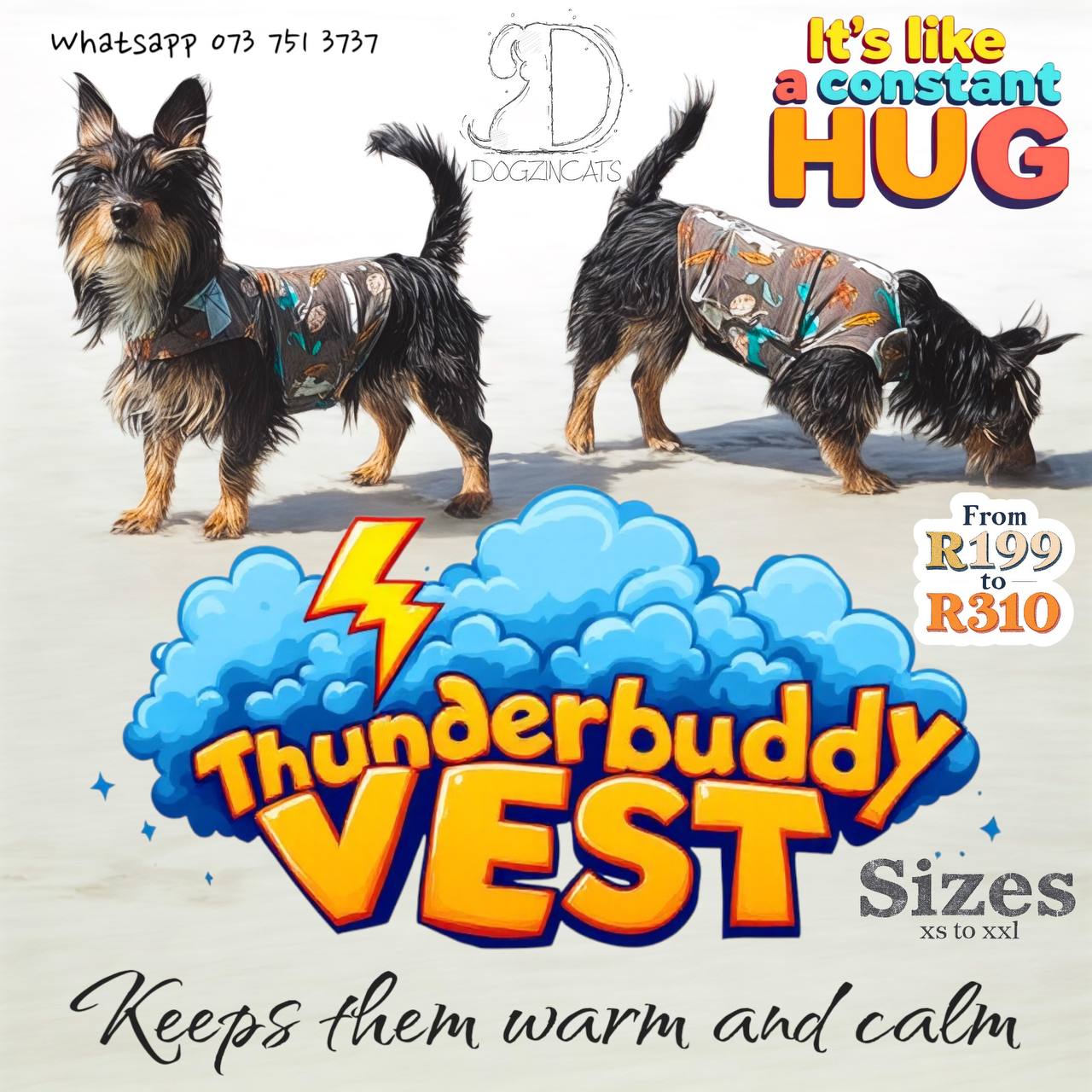 Introducing the Thunderbuddy Calming Vest – a cozy, natural solution to help your furry friend feel calm and collected. Just like swaddling a baby, this vest applies gentle, comforting pressure to ease your dog’s anxiety, whether it’s thunder, fireworks, separation jitters, travel stress, or even those dreaded vet visits.