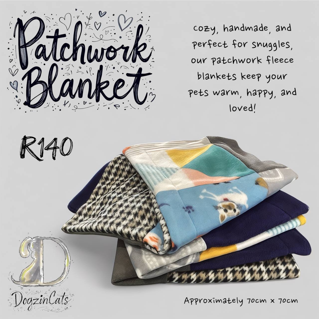 Size of blanket is approximately 70cm x 70cm and is patchworked on both sides.